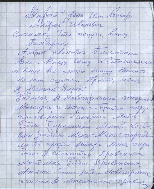 Сообщаю, что получил Вашу бандероль. Андрей Иванович, благодарю Вас, Вашу семью и станичников. Просьбу Вашу я выполняю, опишу свою жизнь немного. Но есть ошибки, простите меня: я Донской Казак!