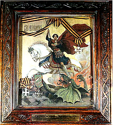 Сия икона святого Великомученика Георгия Победоносца находится в православном Александро-Невском соборе Западно-Европейской Архиепископии русских церквей в Париже. Надпись на дарственной дощечке гласит: "В память русских легионеров, павших на французском фронте от общества попечения о Русском Легионе во Франции". Икона была сооружена в память русских воинов экспедиционного корпуса, принявшего в 1917 году название Русского Легиона Чести, погибших на французском фронте в 1916-1918 годах. Внизу слева на иконе под стеклом -- русский солдатский Георгиевский крест с бантом и французский крест Croix de Guerre rues 2 palmes. Иконописец Соломко.
