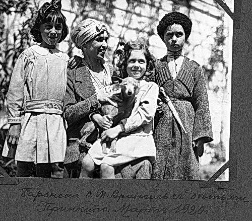 Супруга генерала барона П.Н.Врангеля -- баронесса Ольга Михайловна с детьми Еленой (первая слева), Натальей (третья слева), Петром. На паспарту фотографии рукописная надпись: “Баронесса О.М.Врангель съ детьми. Принкипо. Мартъ 1920 г.”